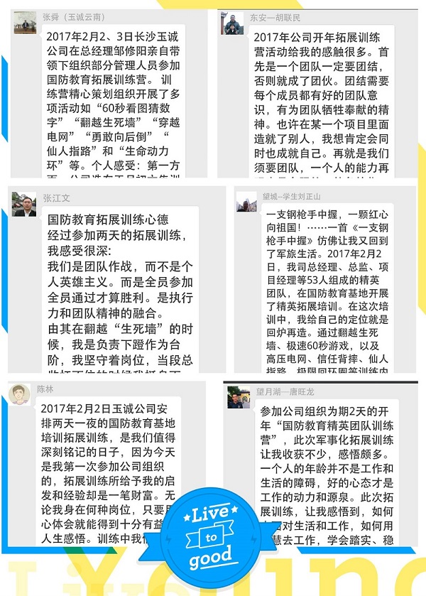 堅(jiān)持優(yōu)良傳統(tǒng),堅(jiān)信“培訓(xùn)是送給員工最好的禮物”,開(kāi)年之初,玉誠(chéng)精英管理團(tuán)隊(duì)齊聚國(guó)防教育基地,開(kāi)展為期兩天一晚的封閉式拓展培訓(xùn),此次培訓(xùn)旨在培養(yǎng)激情、高效的團(tuán)隊(duì)作風(fēng),提升企業(yè)凝聚力、執(zhí)行力和協(xié)作力。